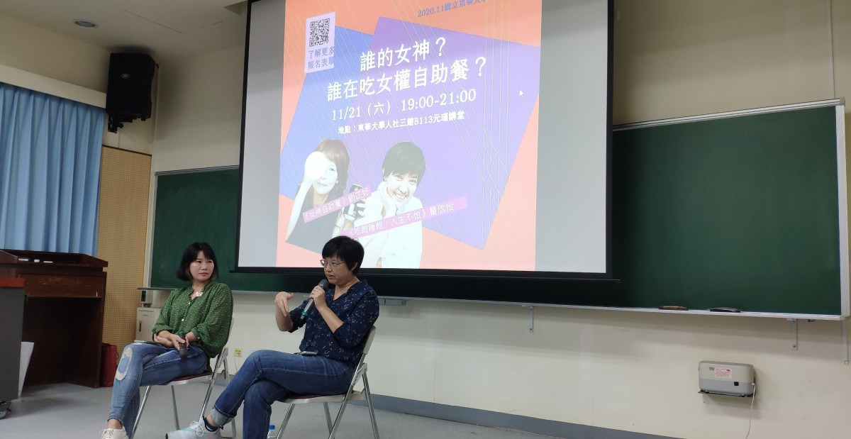 《女神自助餐》劉芷妤與《吃飽睡飽,人生不怕》瞿欣怡(小貓),日前於東華大學人社三館元瑾講堂,以「誰的女神?誰在吃女權自助餐?」為題,進行關於性別的多方位討論,並探索女性如何做、如何行動,如何從自身出發,才能和這個社會、世界舒服地相處呢?