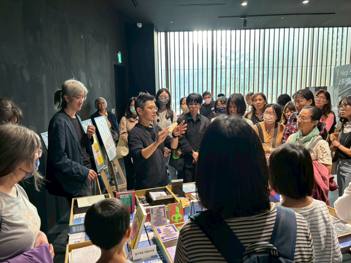 活動結束後,劉霽與陳夏民共同導覽「從 WORD 檔到一本書:出版歷程特展」,除了介紹各式珍本以及一般人鮮少聽到的名詞,如「POD」(Print On Demand)、打樣、紙樣等,也特地分享了珍貴展品如燙金版、打洞刀模版背後的故事,甚至引導大家一起摩擦詩人陳昭淵的新書《體感溫度》——這是一本使用感溫油墨印製封面書衣的詩集,只要用手摩擦或是單純將手放在書上,就會讓原本掩蓋著的黑墨慢慢消失,顯露書籍背後的圖案。