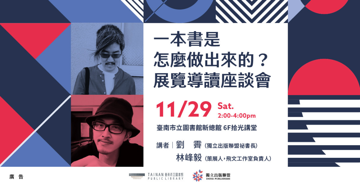 • 講者:劉霽(獨立出版聯盟祕書長)、林峰毅(策展人,飛文工作室負責人)