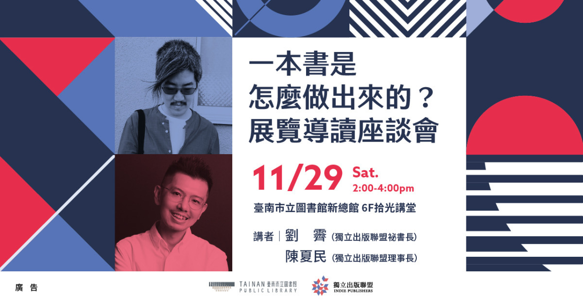 • 講者:劉霽(獨立出版聯盟祕書長)、陳夏民(獨立出版聯盟理事長)